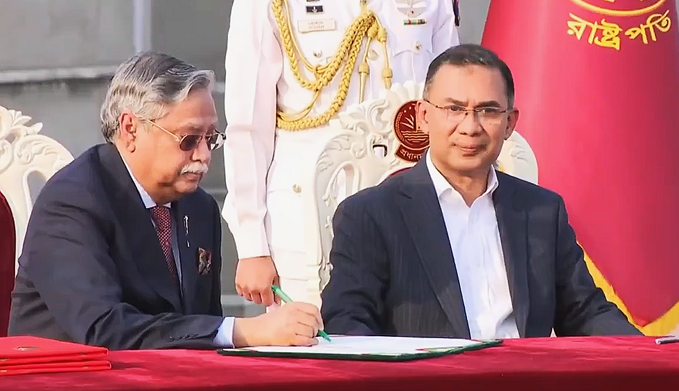 Tarique Rehman being sworn in as Bangladesh's new Prime Minister -- image via news video screenshot